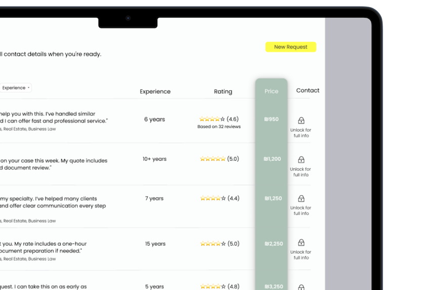 עיין בהצעות מבלי לראות את שם העסק - רק את המסר, המחיר והביקורות.דוגמה:'לקוח יקר, טיפלתי במקרים דומים ואשמח לעזור. המחיר שלי כולל...'